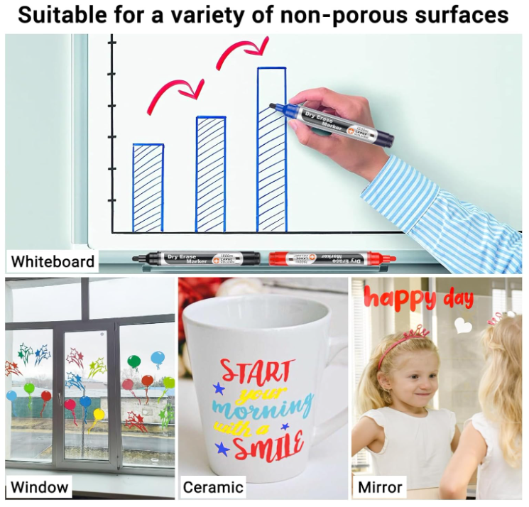 Glass whiteboard markers work best on non-porous surfaces like glass, mirrors, tiles, and metal.